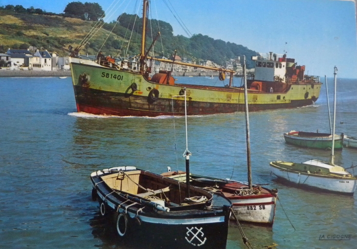 Vue du sablier 'Carbocentre', construit en GB en 1941, entrant au Légué, vers 1960-70, en évitant sur babord les bateaux de pêche de Cesson, dont le bateau pilote du port (AD 22)Immatriculation