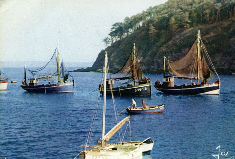 Bateaux de pêche à cabine arrière dans l'avant-port du Légué, à marée haute, vers 1960 (AD 22)Immatriculation
