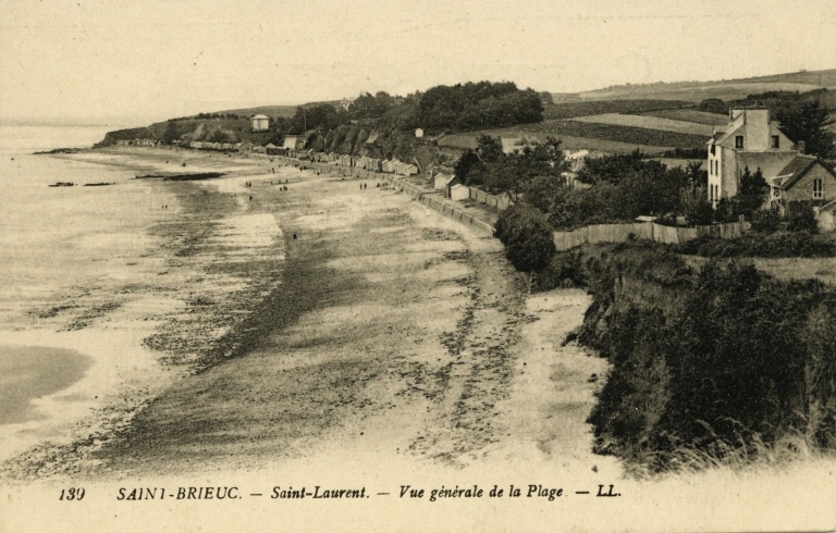 Vue du front de mer de St-Laurent, vers 1932 : remarquer les premières constructions sur les coteaux, vers 1920 (carte postale, AD 22)Immatriculation