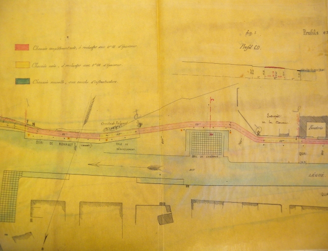 Plan des quais rive droite, en cours d'aménagement en 1888 : remarquer l'emplacement de la fonderie, de l'entrepôt des douanes et du gril de carénage (AD 22)Immatriculation