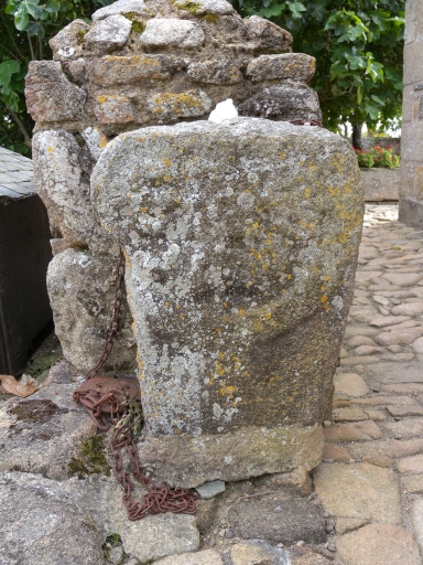 Vue d'une pierre sculptée avec une forme de croix, encastrée dans un petit muret, à proximité de l'ancienne métairie (pierre déplacée)Immatriculation
