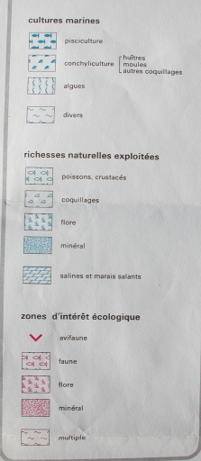 Légende de la carte IPLI (Inventaire Permanent du littoral, 1977) : cultures marines, richesses naturelles exploitées et zones d'intérêt écologique (IGN, 1982)Immatriculation