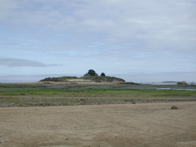 Vue de l'estran et de l'île Coalen : paysage remarquable de la commune à marée basse et territoire des pêcheurs à pied et des goémoniersImmatriculation