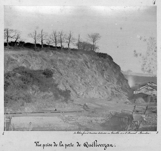 Vue de l'arsenal de Brest en 1880 depuis la porte de Quéliverzan : la Penfeld, le quai. A : Tôles, fers et cornières destinées au Terrible et à l'Amiral Baudin. Atelier des Bâtiments en ferImmatriculation