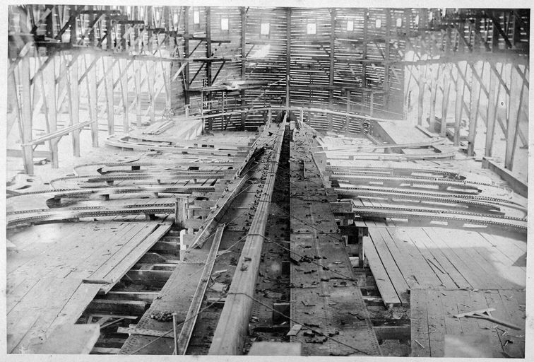 Vue de l'arsenal de Brest en 1880 : intérieur d'un atelier de construction navaleImmatriculation