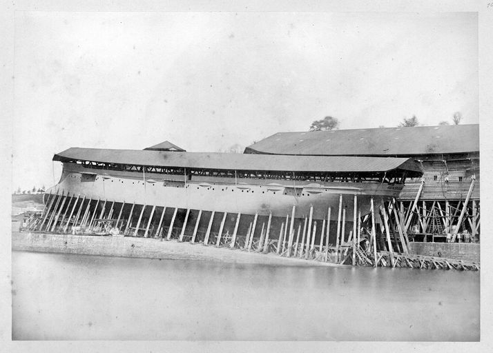 Vue de l'arsenal de Brest en 1880 : construction navale, croiseur de 1ère classe Nielly (classe Lapérouse) à sec sur son fer de lancement (4 mai 1880)Immatriculation