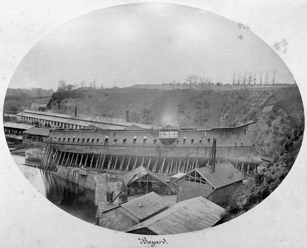 Vue de l'arsenal de Brest en 1880 : la Penfeld, les quais et les cales dite de la Boucherie. Construction navale, le Bayard sur la cale n° 2. Sur la falaise : le plateau du BouguenImmatriculation