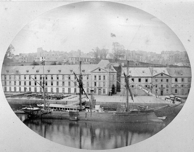 Vue de l'arsenal de Brest en 1880 : la Penfeld, le quai, l'Atelier et Magasin de la voilerie (identification par un plan de 1860 de la Ville et du port de Brest). Navire indéterminé fonctionnant à la voile et à la vapeurImmatriculation
