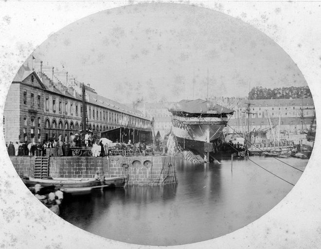 Vue de l'arsenal de Brest en 1880 : la Penfeld et le quai. Lancement du d'Estaing, croiseur de 2ème classe. Atelier de la menuiserie des constructions navales : ?Immatriculation