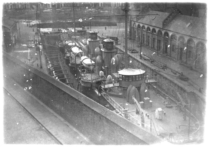 Vue de l'arsenal de Brest vers 1880 : forme de construction, bassin de radoub de Troulan dit forme de BrestImmatriculation