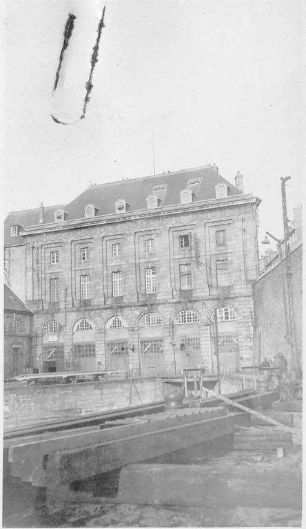 Vue de l'arsenal de Brest en 1934 : bâtiment servant de serrurerie puis bibliothèque (1892) situé derrière la forme de construction, bassin de radoub de Troulan dit forme de BrestImmatriculation
