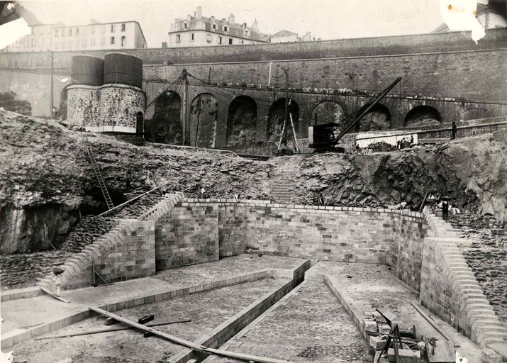 Vue de l'arsenal de Brest entre 1899 à 1902 : travaux d'agrandissement des formes de construction, bassins de radoub de Pontaniou dits formes de Pontaniou. Passage de quatre petites formes à deux grandesImmatriculation