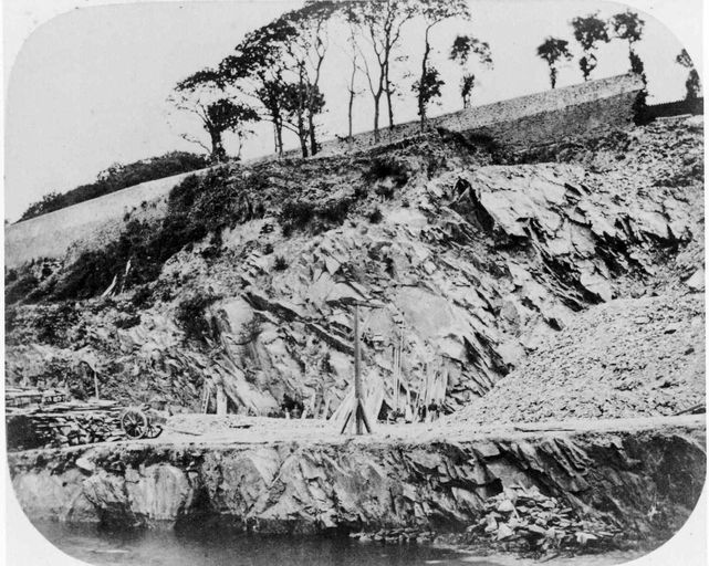 Vue de l'arsenal de Brest en 1859 (?) : travaux d'arrasement et de déroctage de la Montagne du Salou (falaise en schiste). Main d'oeuvre humaine et charettes tirées à dos d'hommes (bagnards : 1858 ?)Immatriculation
