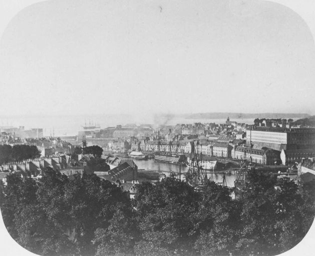 Vue générale de l'arsenal de Brest en 1859. En arrière-plan : la rade de Brest et la presqu'île de CrozonImmatriculation