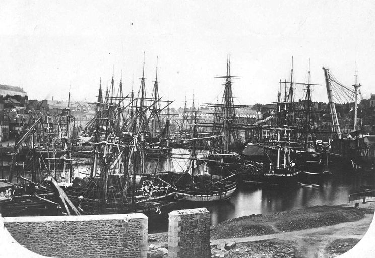 Vue de l'arsenal de Brest en 1848 : la Penfeld, navires au mouillage au niveau de la machine à mâterImmatriculation