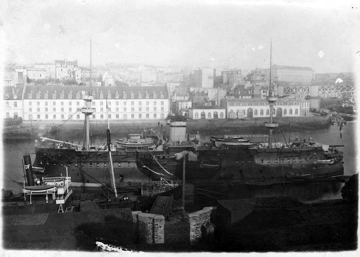Vue de l'arsenal de Brest vers 1880 : navire de guerre cuirassé à vapeur sur le quai Tourville. En arrière-plan : les boulangeries et le quartier de RecouvranceImmatriculation