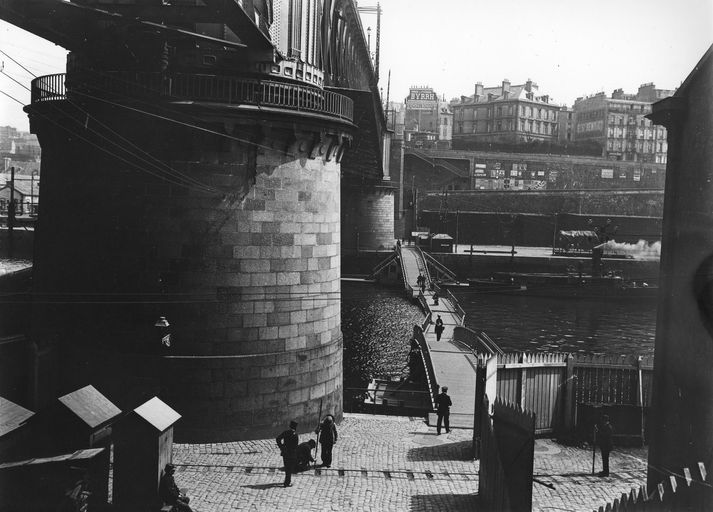 Vue de l'arsenal de Brest après 1861 (date d'achèvement du pont) : le pont tournant ou Pont National. Ici, la pile ouest du pont et le pont flottantImmatriculation