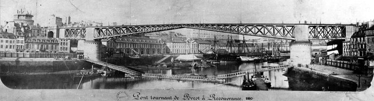 Vue de l'arsenal de Brest en 1880 : le pont tournant à Recouvrance ou Pont National. Il est constitué de deux volées tournantes qui permettent aux bateaux à haute mâture de remonter la PenfeldImmatriculation