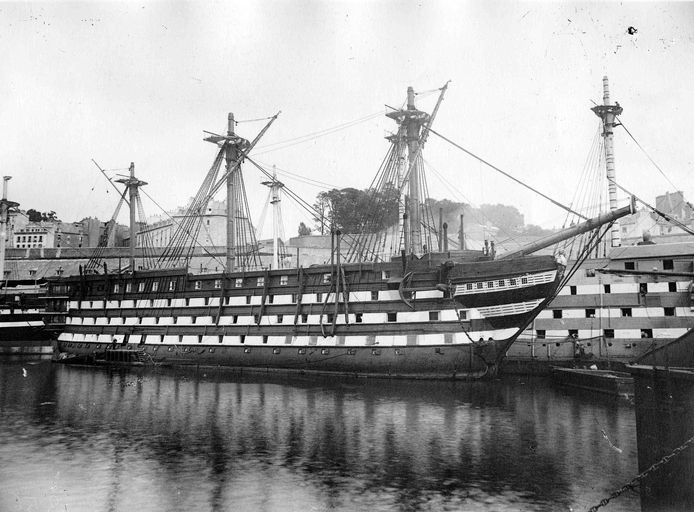 Vue de l'arsenal de Brest vers 1880 : la Penfeld. Le navire à voile Borda est à couple d'un autre navireImmatriculation