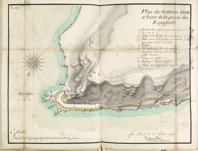 Plan des batteries haute et basse de la pointe des Espagnols, fait à Brest le 15 juillet 1695 et signé par Vauban. Bibliothèque du Génie, Manuscrit in f°33g tome 2 atlasImmatriculation