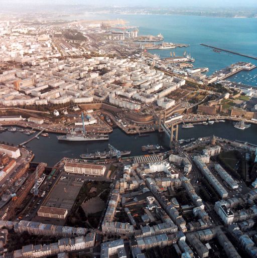 Vue aérienne oblique de Brest en 1984 : la Penfeld, l'arsenal, Recouvrance (rive droite), les casernes et les formes de Pontaniou, le pont de Recouvrance, la ville (rive gauche), le château. En arrière-plan : le port de commerce, Poullic Al LorImmatriculation