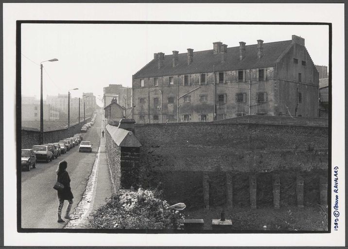 La prison de Pontaniou par Bruno Ravalard, 1989 : le bâtiment carcéral depuis le carrefour des rues du Carpon et de Pontaniou. A gauche, la rue de PontaniouImmatriculation