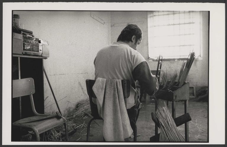 La prison de Pontaniou par Bruno Ravalard, 1989 : l'atelier vannerie au 3ème étage, un détenu photographié de dos est en train de rempailler une chaise avec de l'osierImmatriculation