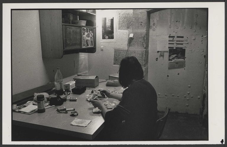 La prison de Pontaniou par Bruno Ravalard, 1989 : un détenu de dos mangeant à sa table dans une celluleImmatriculation