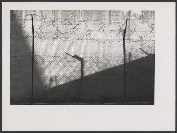La prison de Pontaniou par Bruno Ravalard, 1989 : cour de promenade Nord, ombre des barbelés projeté sur le mur de clôture