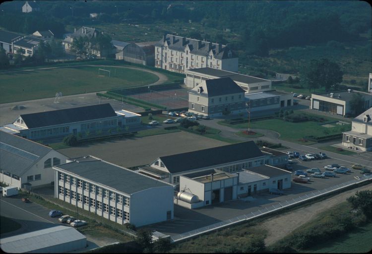 Vue aérienne oblique des bâtiments en 1980 : bâtiments annexes et terrain de sportImmatriculation