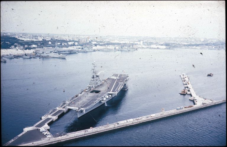 Vue aérienne oblique de l'arsenal de Brest : épis pour porte-avionsImmatriculation