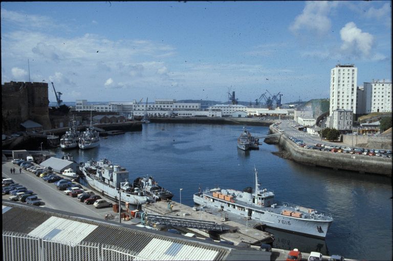 Vue de l'arsenal de Brest en Penfeld en 1980 : un navire transrade côté rive gaucheImmatriculation
