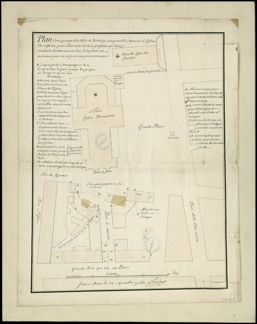 Plan d'ensemble de l'église Saint-Louis : projet de voirie, aménagement d'une avenue au lieu de la petite rue tortueuse, projet de place en fer à cheval, fait à Brest le 12 septembre 1742 par FrézierImmatriculation