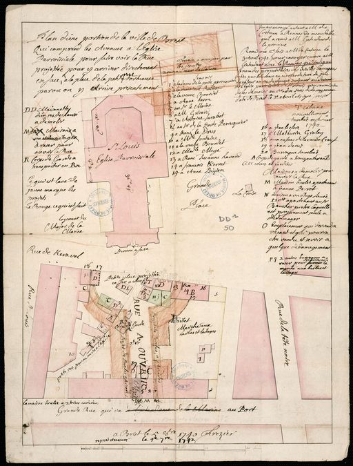 Plan d'ensemble de l'église Saint-Louis : projet de voirie, aménagement d'une avenue au lieu de la petite rue tortueuse, projet de place en fer à cheval, fait à Brest le 5 octobre 1740 revu le 4 septembre 1742 par FrézierImmatriculation