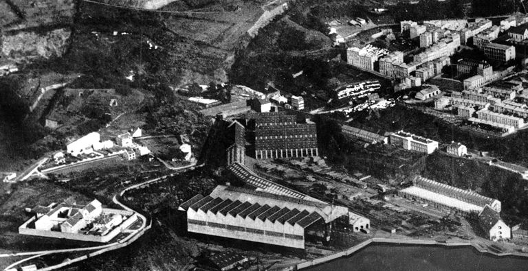 Vue aérienne oblique de Brest en 1926 : la Penfeld, l'anse du Moulin à poudre et sa porte (aujourd'hui porte de la Brasserie), la prison du Bouguen sur le plateau homonyme et les fortificationsImmatriculation