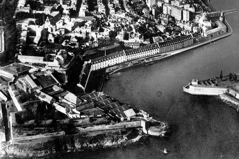 Vue aérienne oblique de Brest en 1926 : l'embouchure de la Penfeld, les bâtiments de l'arsenal, Recouvrance (rive droite), la batterie du fer à cheval et les fortifications de la villeImmatriculation