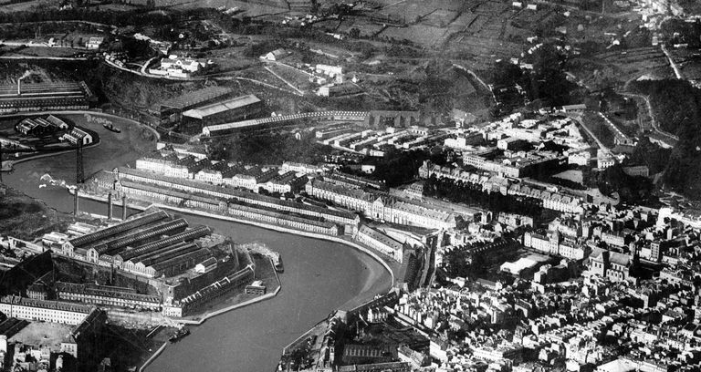 Vue aérienne oblique de Brest en 1926 : la Penfeld, Brest même (rive gauche), l'hôpital maritime, le bagne, les corderies haute et basse et Recouvrance (rive droite), les ateliers du plateau des Capucins. A l'arrière-plan : le BouguenImmatriculation