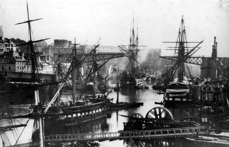 Vue de l'arsenal de Brest vers 1865 : le pont tournant ou Pont National ouvert. Le Louis XIV escorté de nombreux navires franchissant le pont impérialImmatriculation