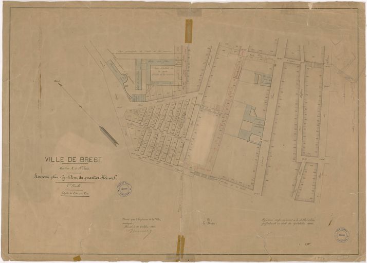 Quartier de Keravel à Brest : nouveau plan régulateur, section A de Saint Louis, 2ème feuille : copie du cadastre avec numéros de parcelles. Repères de nivellement. Projet en surimpression. 1905 par Meunier, ingénieur de la ville de BrestImmatriculation
