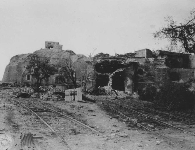 Vue de la festung Brest pendant la bataille de Brest, U.S. Army Signal Corps, septembre 1944 : entrée du tunnel (aménagé dans l'ancien fossé sec du château) de la voie de chemin de fer de l'arsenalImmatriculation