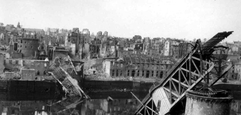 Vue de la festung Brest pendant la bataille de Brest, U.S. Army Signal Corps, septembre 1944 : bâtiments de l'arsenal et le pont tournant détruits. En arrière-plan : Recouvrance, le quartier intra-muros de la rive gauche dévastéImmatriculation