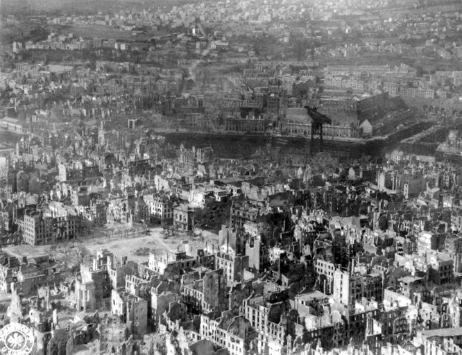 Vue de la festung Brest pendant la bataille de Brest, U.S. Army Signal Corps, septembre 1944 : vue aérienne oblique de la ville dévastéeImmatriculation