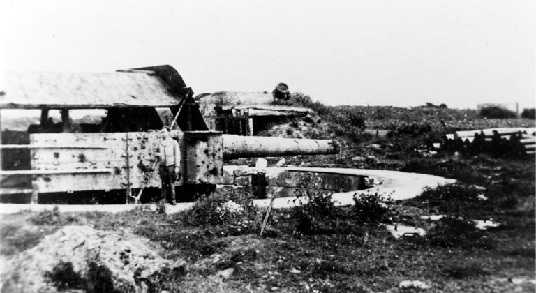 Vue de l'un des canons de 28 cm après les combats de septembre 1944Immatriculation