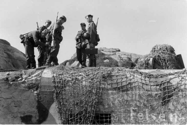 Vue d'un groupe de cinq soldats sur la dalle de couverture du bunker nommé Felsen (collection particulière). Surmonté d'une tourelle de char Renault FT, le bunker est camouflé par des peintures et un filet... Il s'agit d'une photographie de propagandeImmatriculation