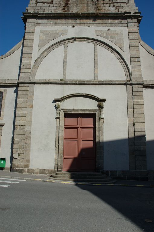 Vue de l'élévation sud : travée centrale soulignée d'un arc plein cintre en granite, écoinçons et pilastresImmatriculation