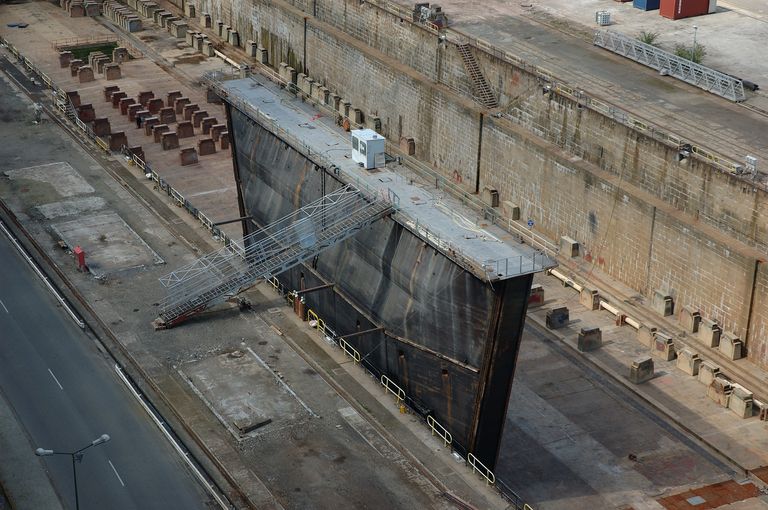 Vue d'ensemble des formes de construction, bassins de radoub actuellement bassins n° 4, 6 et 7 depuis le pont de l'Harteloire : bassin n° 4, porte de l'écluseImmatriculation