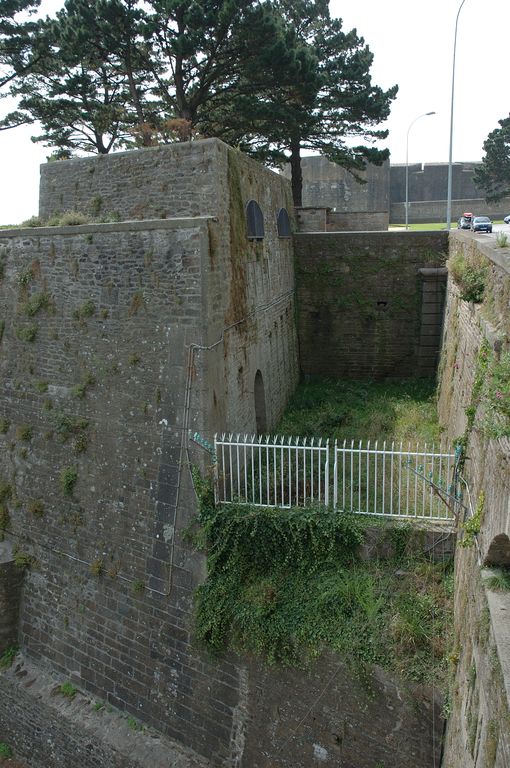 Vue des vestiges des fortifications d'agglomération de Brest : corps de garde percé de créneaux de fusillade flanquant la porte du Port de CommerceImmatriculation