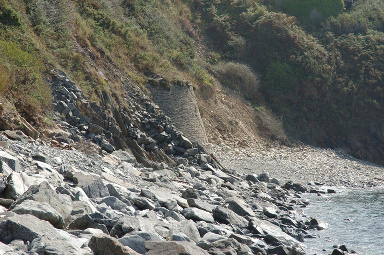 Vue de situation depuis la grève : les embrasures se trouvaient à droite du massif de maçonnerie (état en 2008)Immatriculation