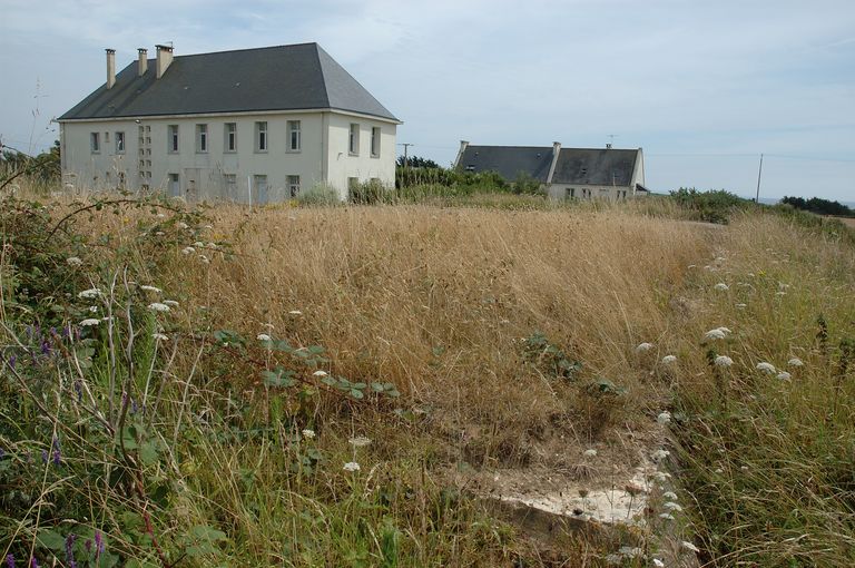 Vue de l'ensemble fortifié situé à l'ouest de Plougonvelin de part et d'autre de la Départementale n° 85 : blockhaus de grandes dimensions (peut-être une soute à munitions pour la batterie de Keringar)Immatriculation