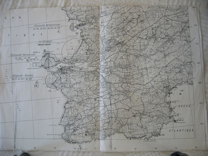 Carte allemande des ensembles fortifiés du groupe défensif côtier de Saint-Renan codé Re (Re 33 - 83 ; Re 99 - Re 124 ; Re 301 - 306 ; Re 315 ; Re 319 ; Re 503)Immatriculation